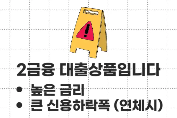 2금융 상품은 1금융에 비하여, 금리가 높고, 연체시 신용점수의 변동폭이 큽니다. 그렇기 때문에 2금융 대출을 시도하기 이전에 1금융 대출상품 중 가능한 것이 있는지 충분히 알아볼 필요가 있습니다.
